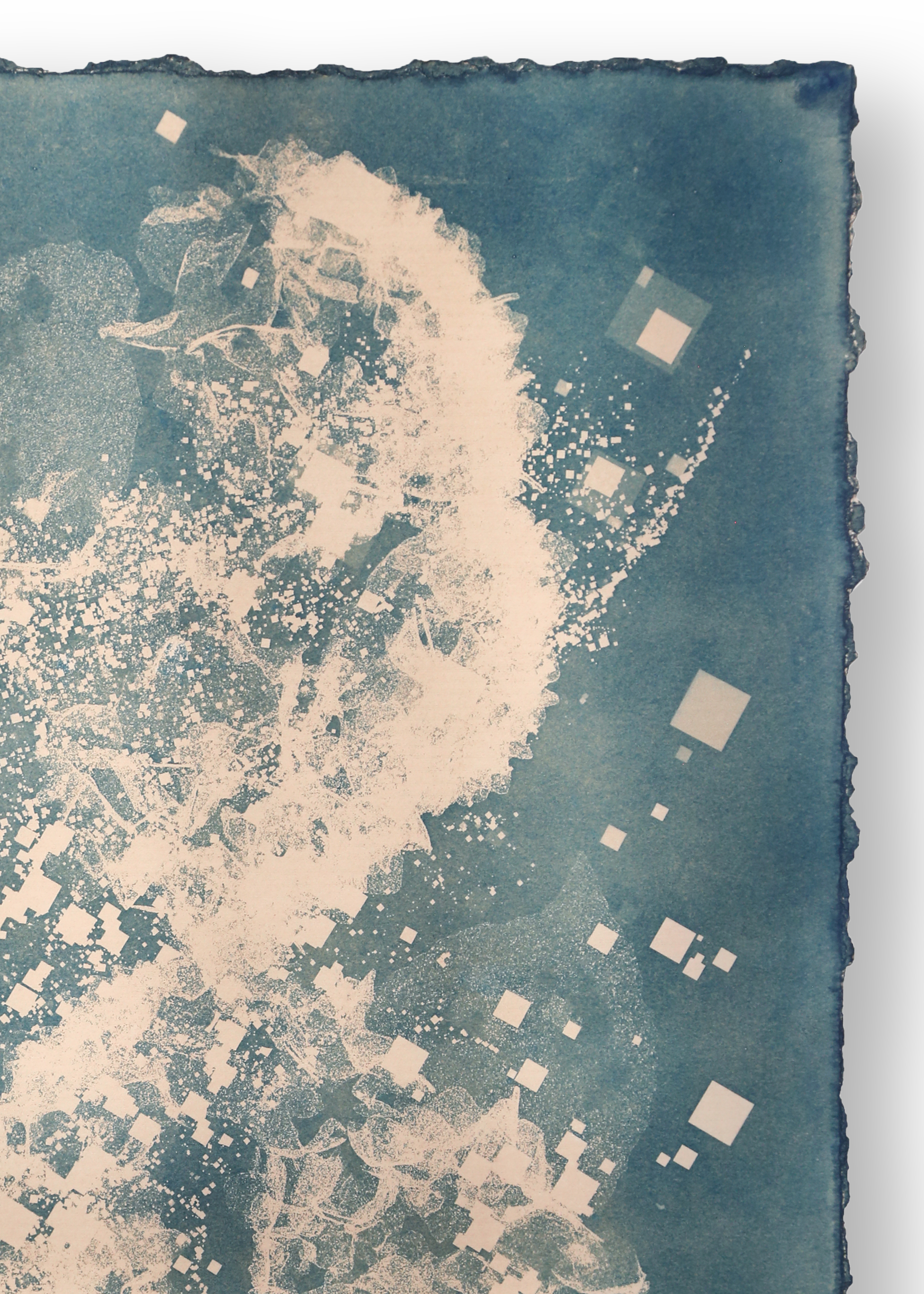 "Biogram Toneprint: Hydrangea 1.8" explores the digitizing of organic structures through invisible light frequencies. Created from a 3D scan of a hydrangea flower, this unique cyanotype is hand toned with organic teas, capturing the exquisite details of the natural world through digital eyes.