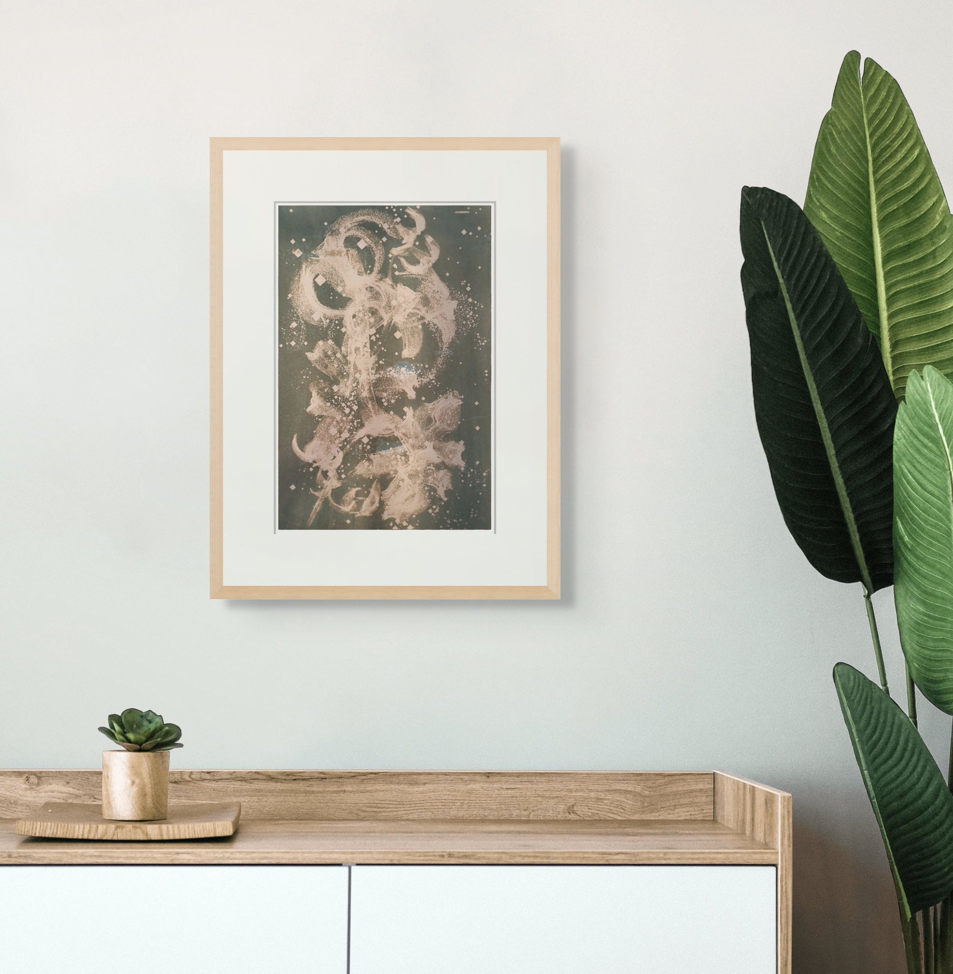 Frame is for illustrative purposes only, artwork is packaged and shipped carefully rolled in a tube. To commission a custom artist frame contact studio@joteva.com