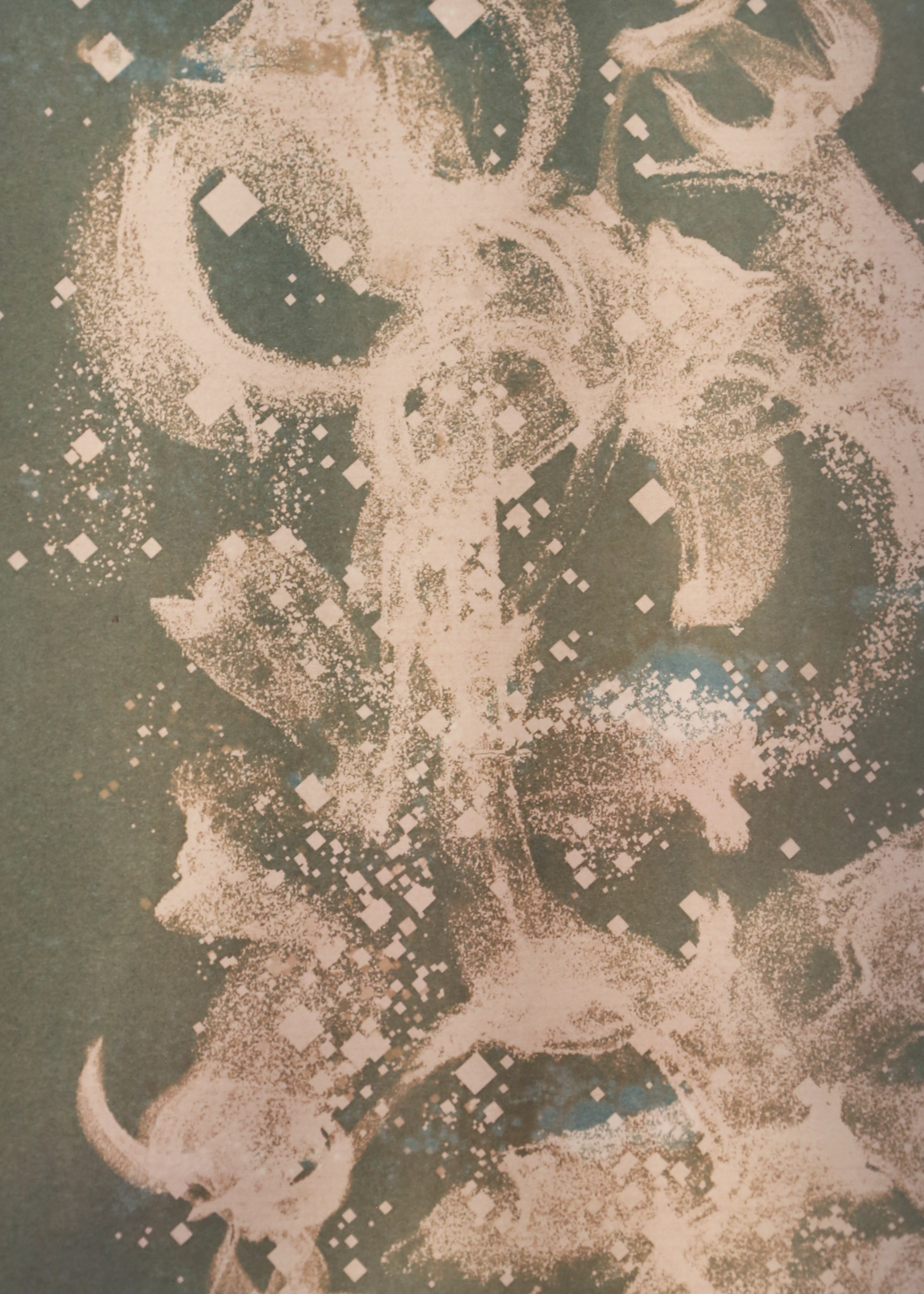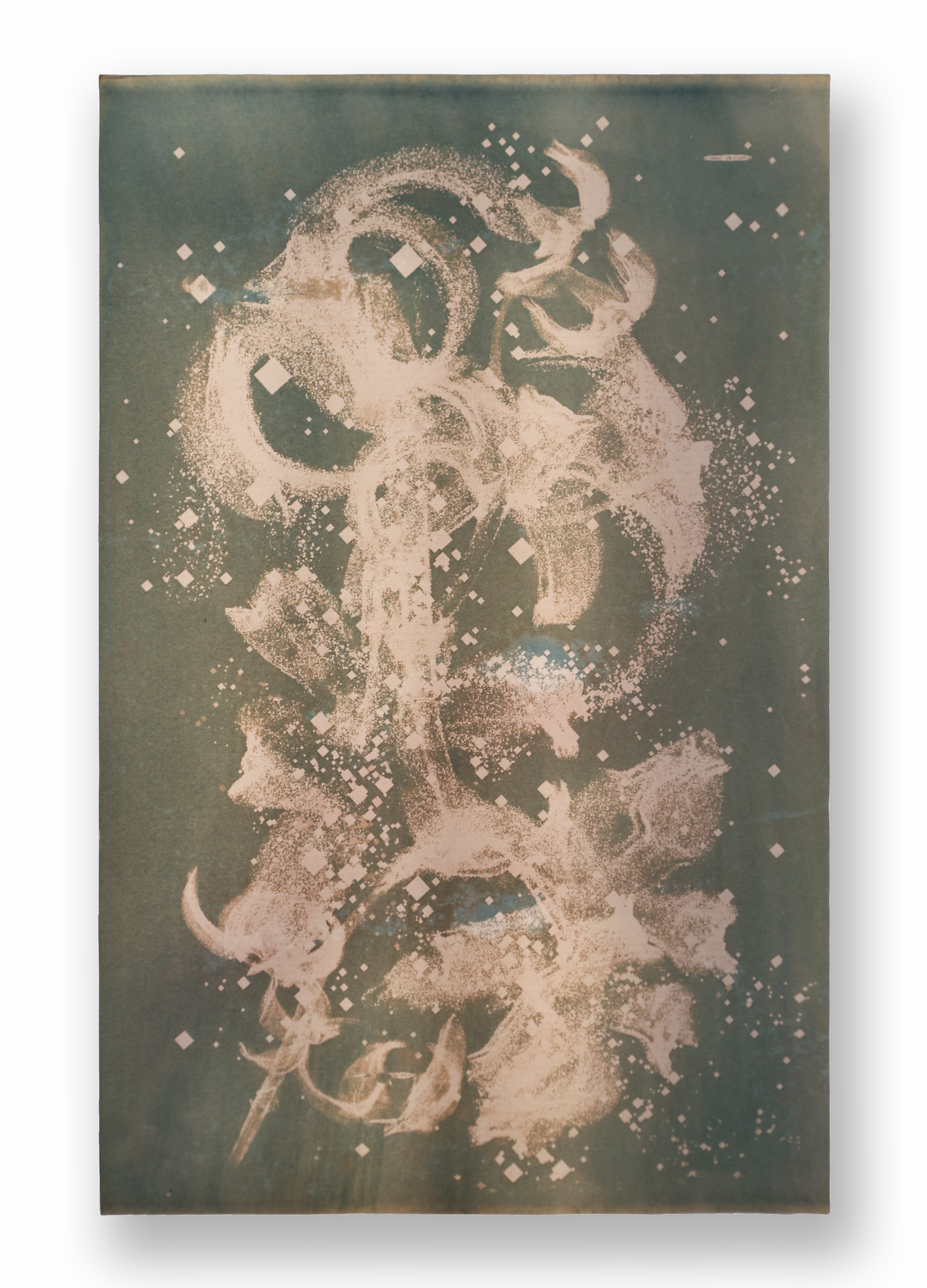"Biogram Toneprint: Lilium Lancfolium 1.2" explores the digitizing of organic structures through invisible light frequencies. Created from a 3D scan of a tiger lily flower, this unique cyanotype is hand toned with organic teas, capturing the exquisite details of the natural world through digital eyes.