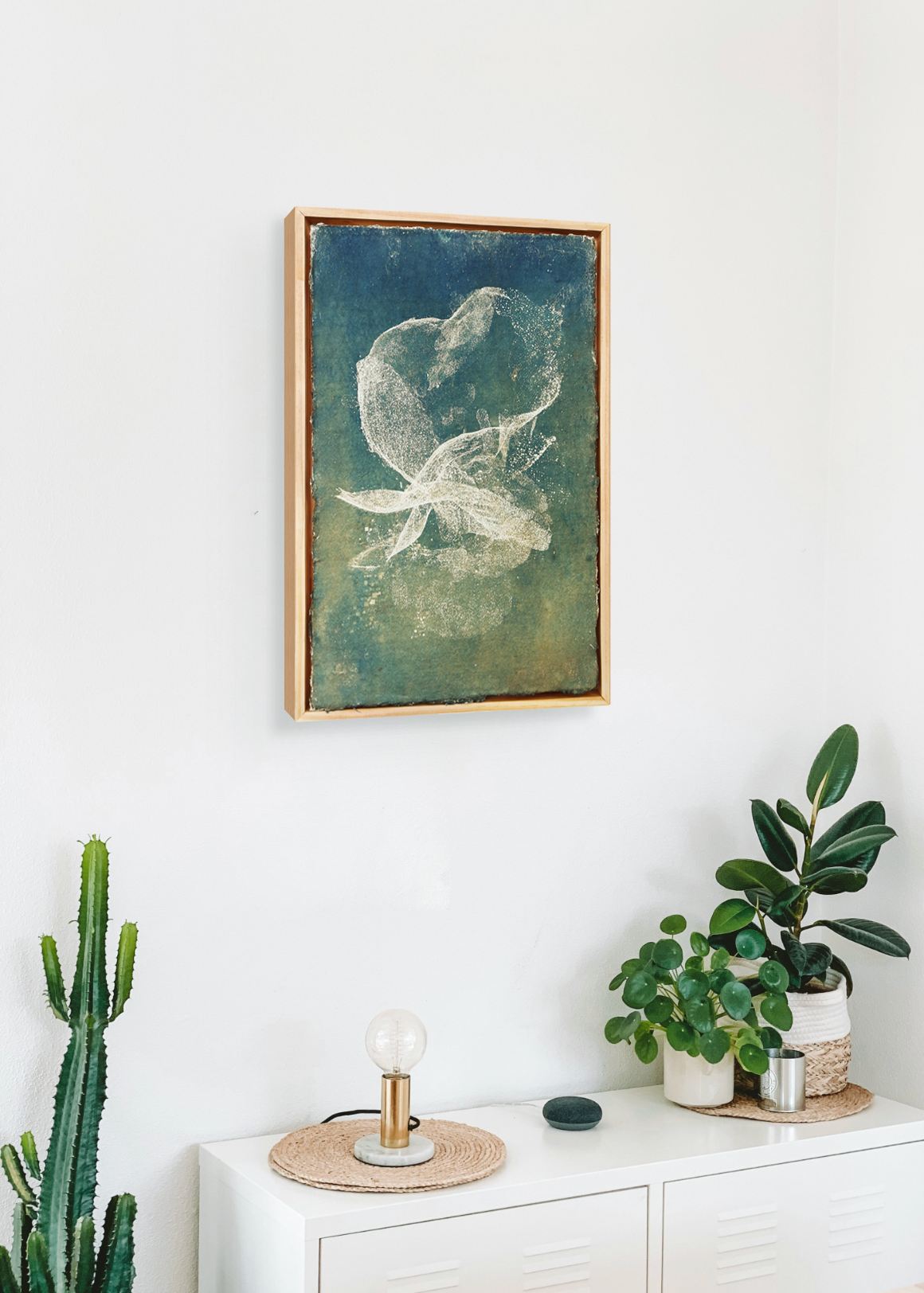 "Biogram Toneprint: Orchis in Fold 1.2" explores the digitizing of organic structures through invisible light frequencies. Created from a 3D scan of an orchid flower, this unique cyanotype is hand toned with organic teas, capturing the exquisite details of the natural world through digital eyes.
